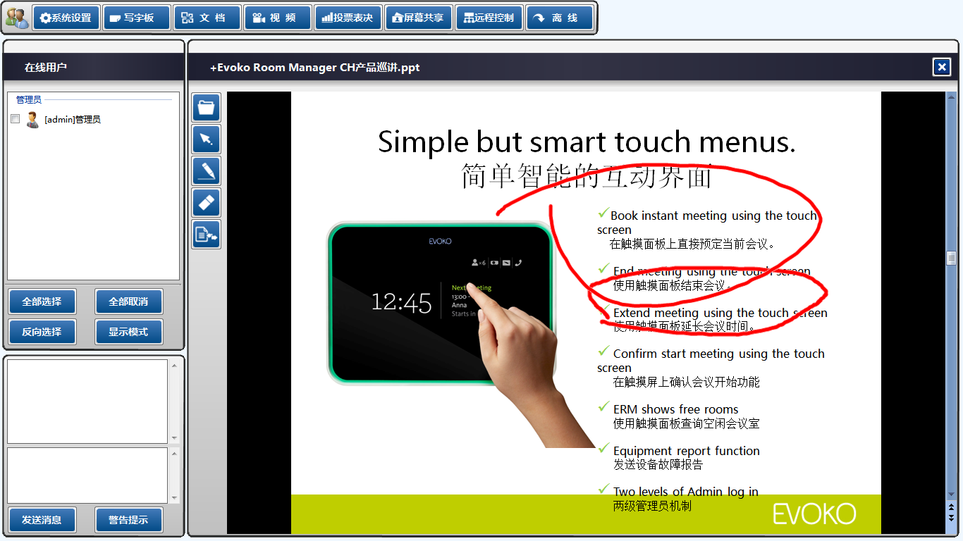 智能会议系统是专门针对商务会议、及企业培训而研发的一套智能化服务平台,基于世界先进的多点触控技术、音视频图像处理技及网络通信技术研发而成。智能会议系统更强调了无纸化、环保、安全保密、使用便捷、功能强大的理念,在系统设计上完全能够满足商务会议的各种功能需求,从而真正实现无纸化会议。智能会议系统蕴含的环保、高智能化的理念更体现了系统的价值所在。适用于中高端小型会议室、大型报告厅、企业培训教室等。